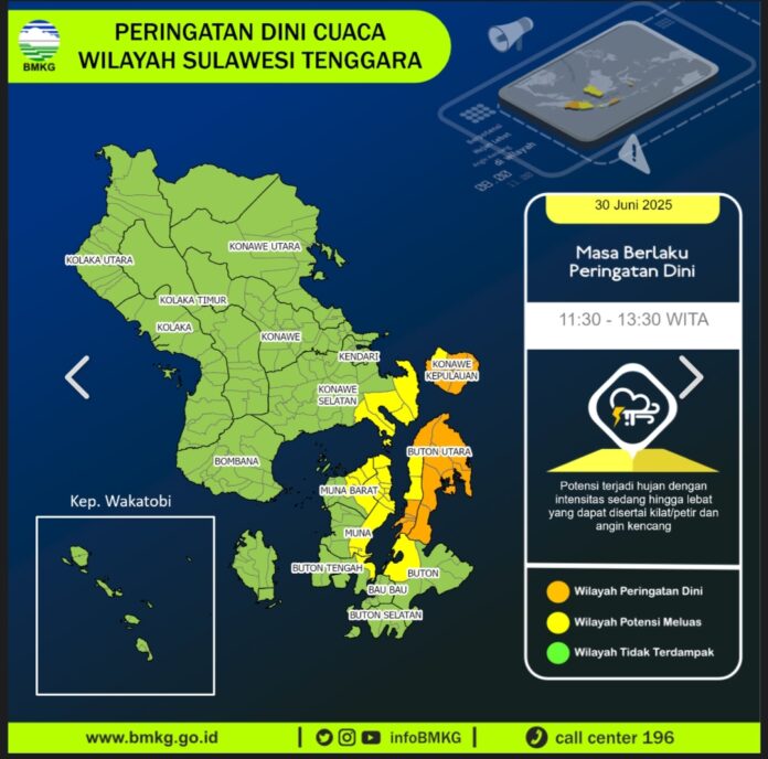 Kendari, PancanaNews.com – Badan Meteorologi, Klimatologi, dan Geofisika (BMKG) Sulawesi Tenggara mengeluarkan peringatan dini cuaca pada Senin (30/6/2025) pukul 11.10 WITA.