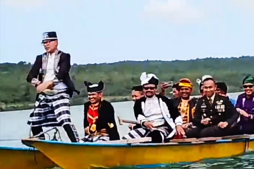 Wakil Menteri Dalam Negeri (Wamendagri) Bima Arya Sugiarto, yang masih mengenakan busana adat Buton lengkap dengan ikat kepala, tiba-tiba berdiri di bagian depan perahu panjang.