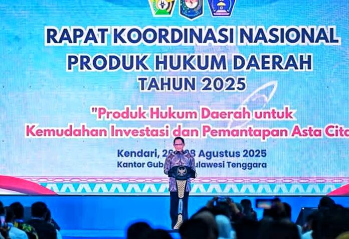 Kendari, PancanaNews.com– Menteri Dalam Negeri, Muhammad Tito Karnavian, secara resmi membuka Rapat Koordinasi Nasional Produk Hukum Daerah (Rakornas PHD) 2025 yang digelar di Aula Bahteramas, Kantor Gubernur Sulawesi Tenggara, Rabu (27/8/2025).