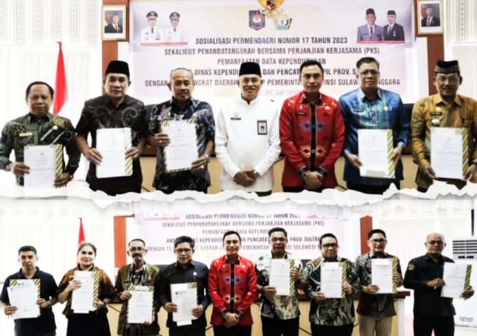 Kendari, PancanaNews.com – Pemerintah Provinsi Sulawesi Tenggara melalui Dinas Kependudukan dan Pencatatan Sipil (Dukcapil) resmi menandatangani Perjanjian Kerja Sama (PKS) Pemanfaatan Data Kependudukan berbasis Nomor Induk Kependudukan (NIK) bersama 15 Organisasi Perangkat Daerah (OPD) lingkup Pemprov Sultra.