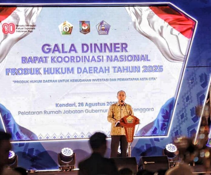 Kendari, PancanaNews.com– Rapat Koordinasi Nasional (Rakornas) Produk Hukum Daerah (PHD) Tahun 2025 resmi dibuka dengan penyelenggaraan Gala Dinner di pelataran Rumah Jabatan (Rujab) Gubernur Sulawesi Tenggara, Selasa (26/8/2025).