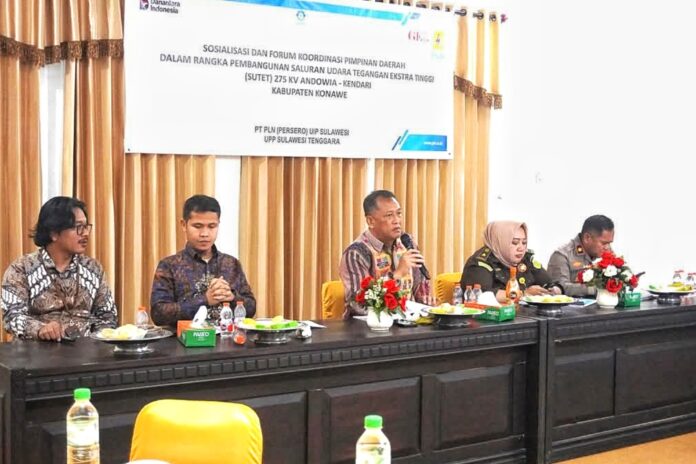 Konawe, PancanaNews.com– Sekretaris Daerah (Sekda) Kabupaten Konawe, Dr. Ferdinand, SP., MH, mewakili Bupati Konawe, secara resmi membuka kegiatan sosialisasi dan Forum Koordinasi Pimpinan Daerah (Forkopimda) pembangunan Saluran Udara Tegangan Ekstra Tinggi (SUTET) 275 kV Andowia–Kendari, di Aula Inowa, Kamis (28/8/2025).