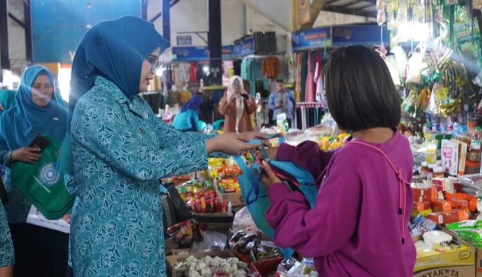 Mereka menyusuri lorong pasar, membagikan tas kain kepada masyarakat, sekaligus memberikan edukasi tentang bahaya penggunaan plastik sekali pakai bagi lingkungan dan kesehatan.